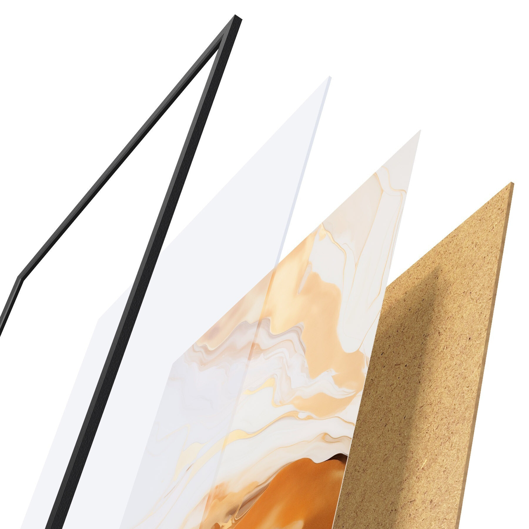 Das Poster besteht aus einem Rahmen, Plexiglas, einem gedruckten Bild und einer Rückwand aus Spanplatten. Dank der Halterungen auf der Rückseite kann das Poster sofort an die Wand gehängt werden.