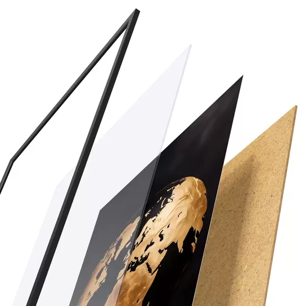 Das Poster besteht aus einem Rahmen, Plexiglas, einem gedruckten Bild und einer Rückwand aus Spanplatten. Dank der Halterungen auf der Rückseite kann das Poster sofort an die Wand gehängt werden.