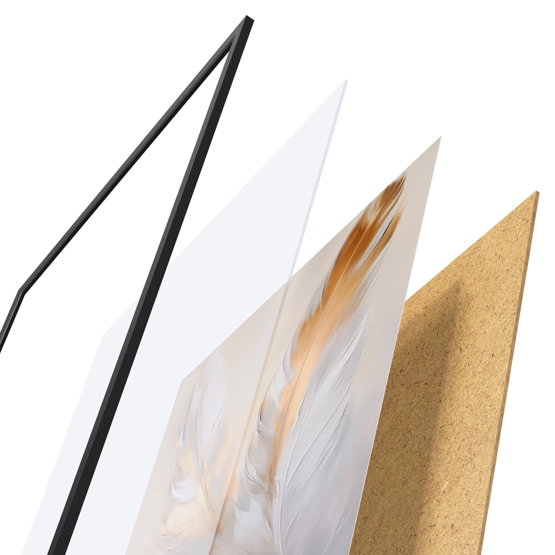 Das Poster besteht aus einem Rahmen, Plexiglas, einem gedruckten Bild und einer Rückwand aus Spanplatten. Dank der Halterungen auf der Rückseite kann das Poster sofort an die Wand gehängt werden.