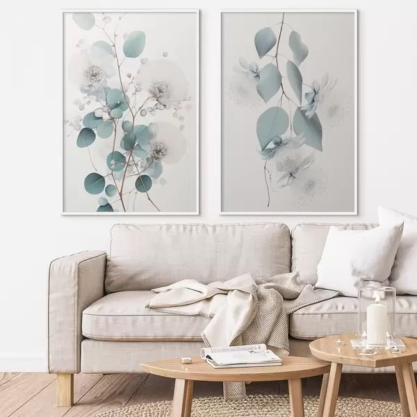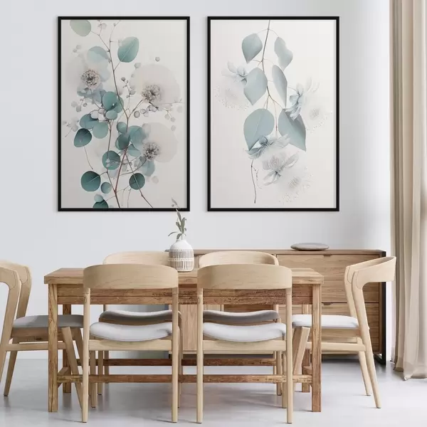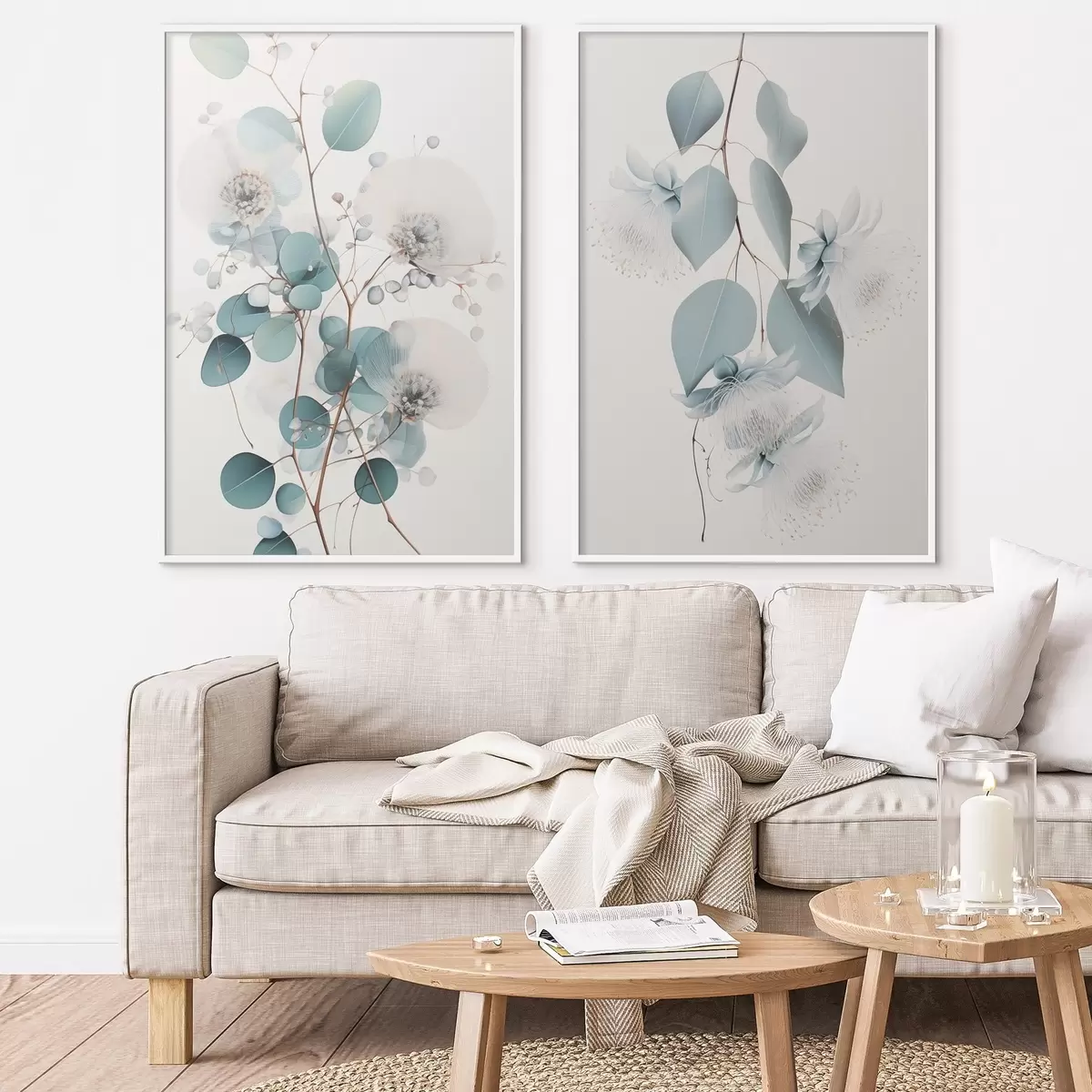 Poster Eukalyptuszweig mit blauen Blättern und weißen Blüten, heller Hintergrund Nr d00829