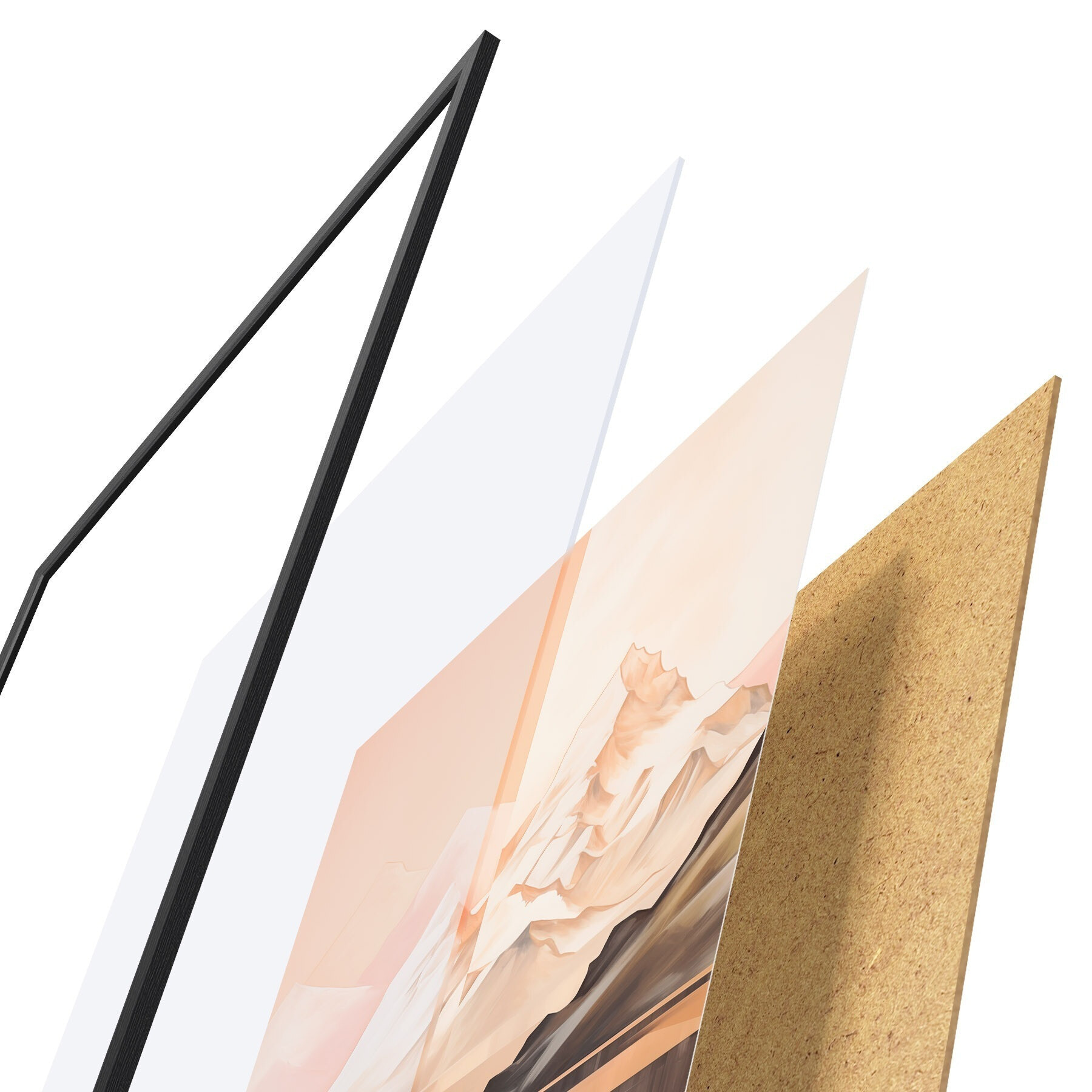Das Poster besteht aus einem Rahmen, Plexiglas, einem gedruckten Bild und einer Rückwand aus Spanplatten. Dank der Halterungen auf der Rückseite kann das Poster sofort an die Wand gehängt werden.