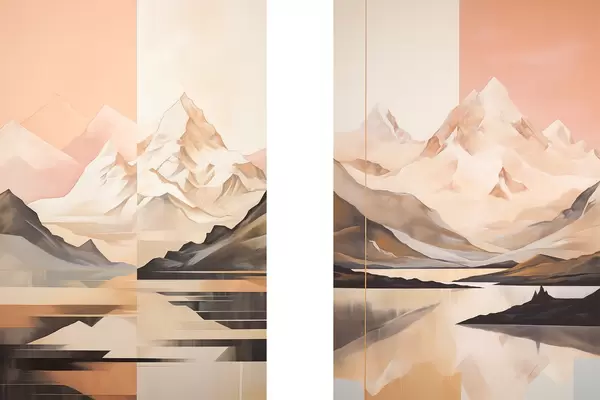 Poster Abstrakte Landschaft mit Bergen und einem See, Pastellfarben, minimalistischer Stil d00830