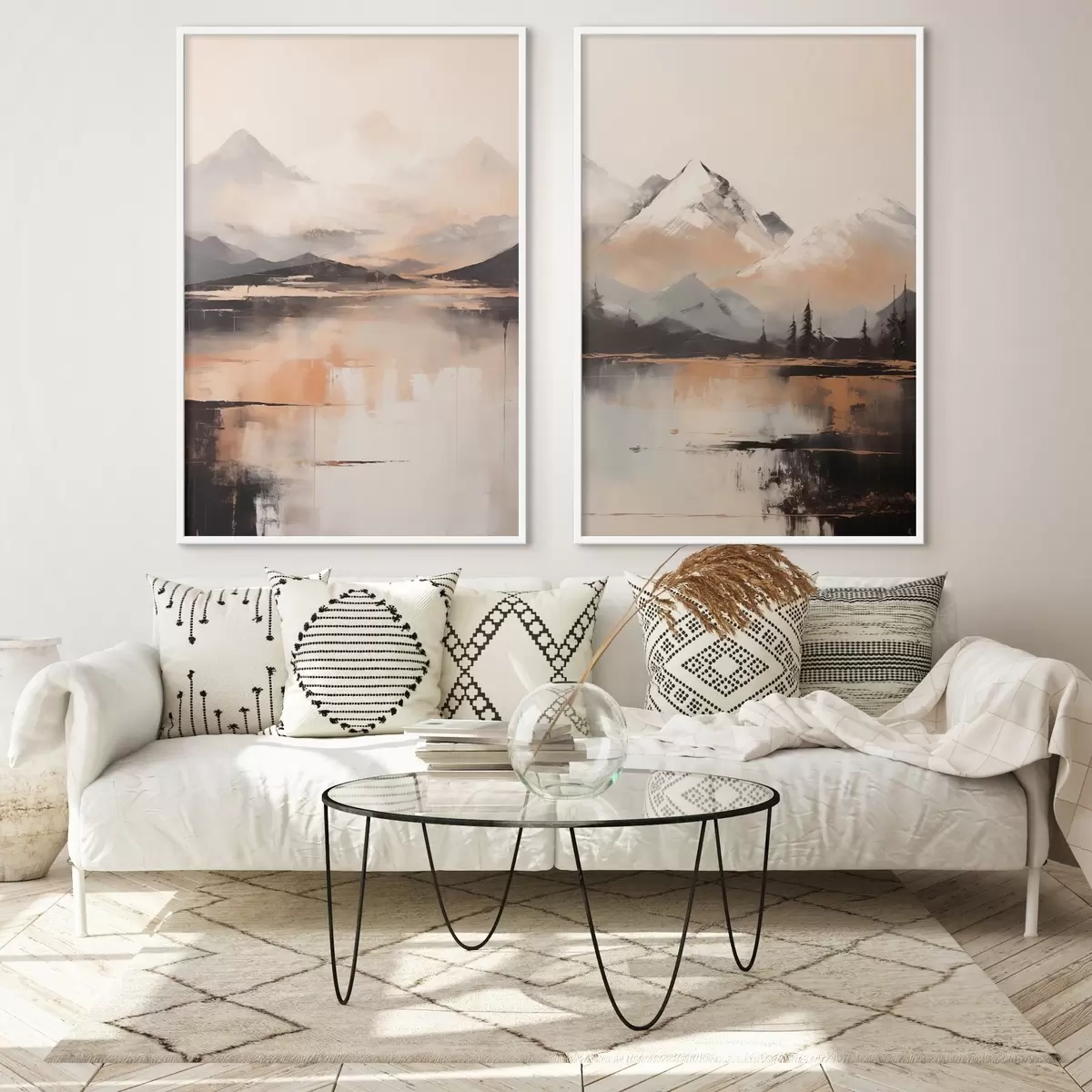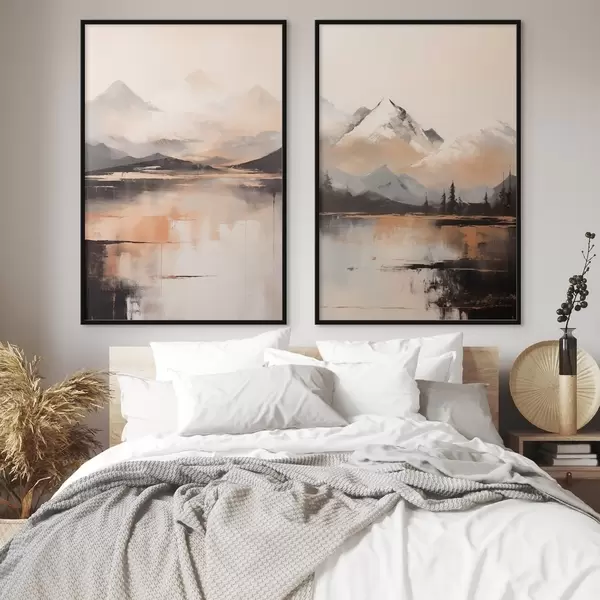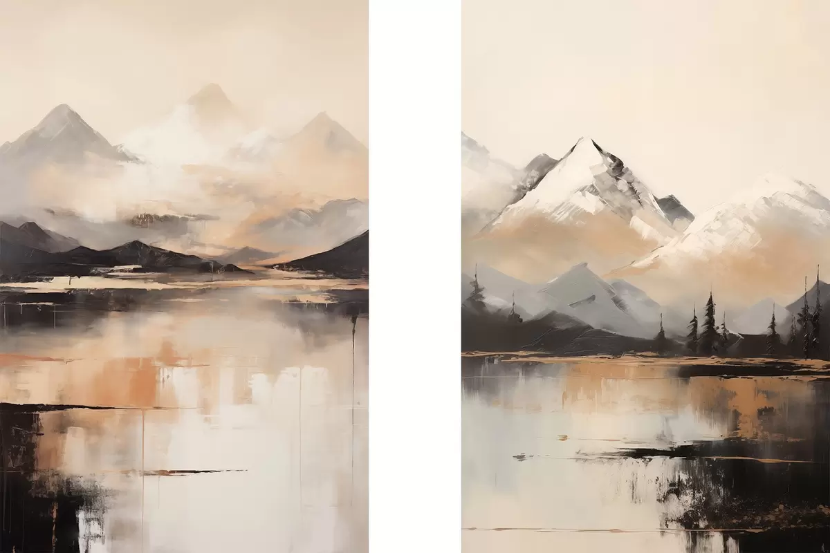 Poster Eine Landschaftsmalerei mit Struktur, die Berge und einen See imitiert Nr d00831