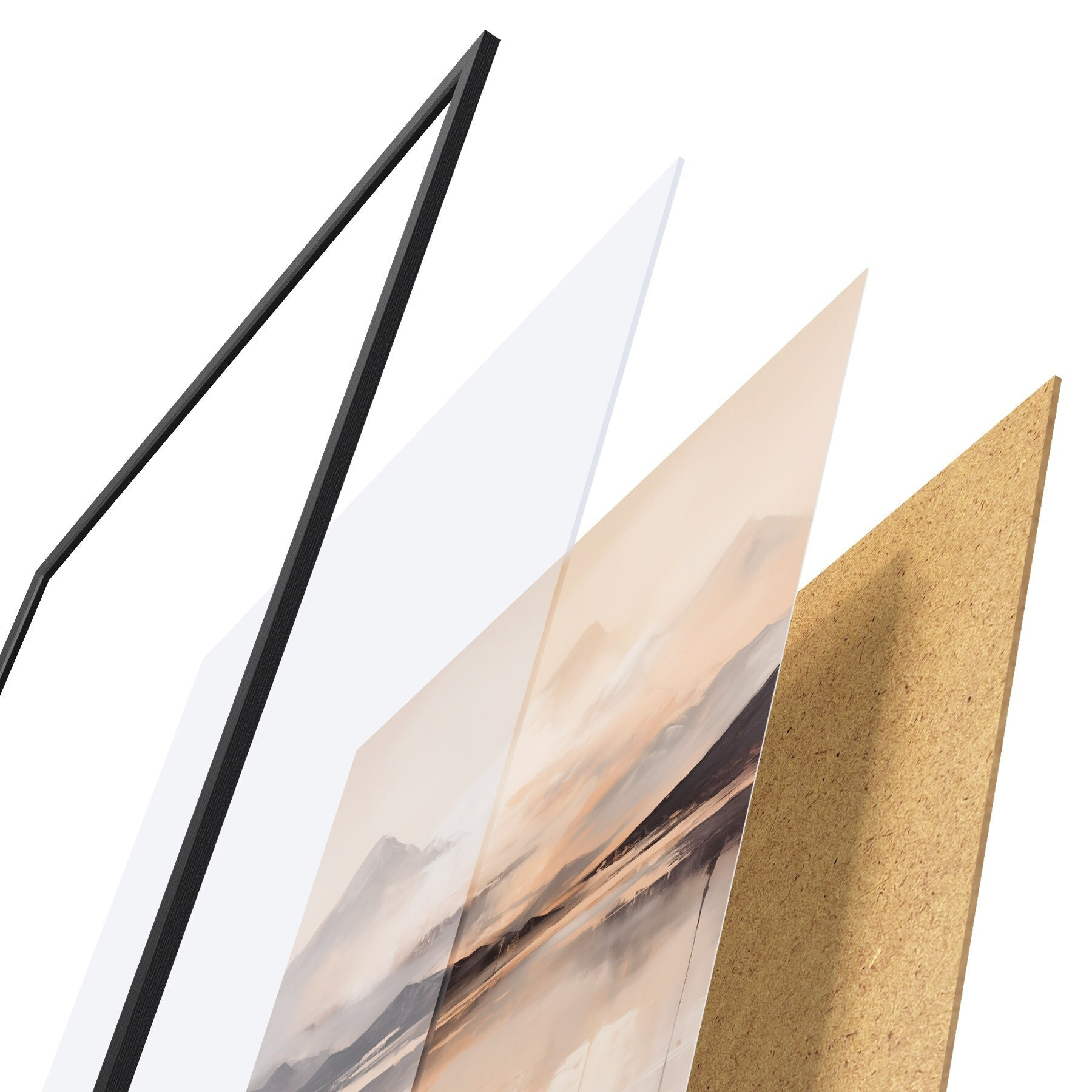 Das Poster besteht aus einem Rahmen, Plexiglas, einem gedruckten Bild und einer Rückwand aus Spanplatten. Dank der Halterungen auf der Rückseite kann das Poster sofort an die Wand gehängt werden.