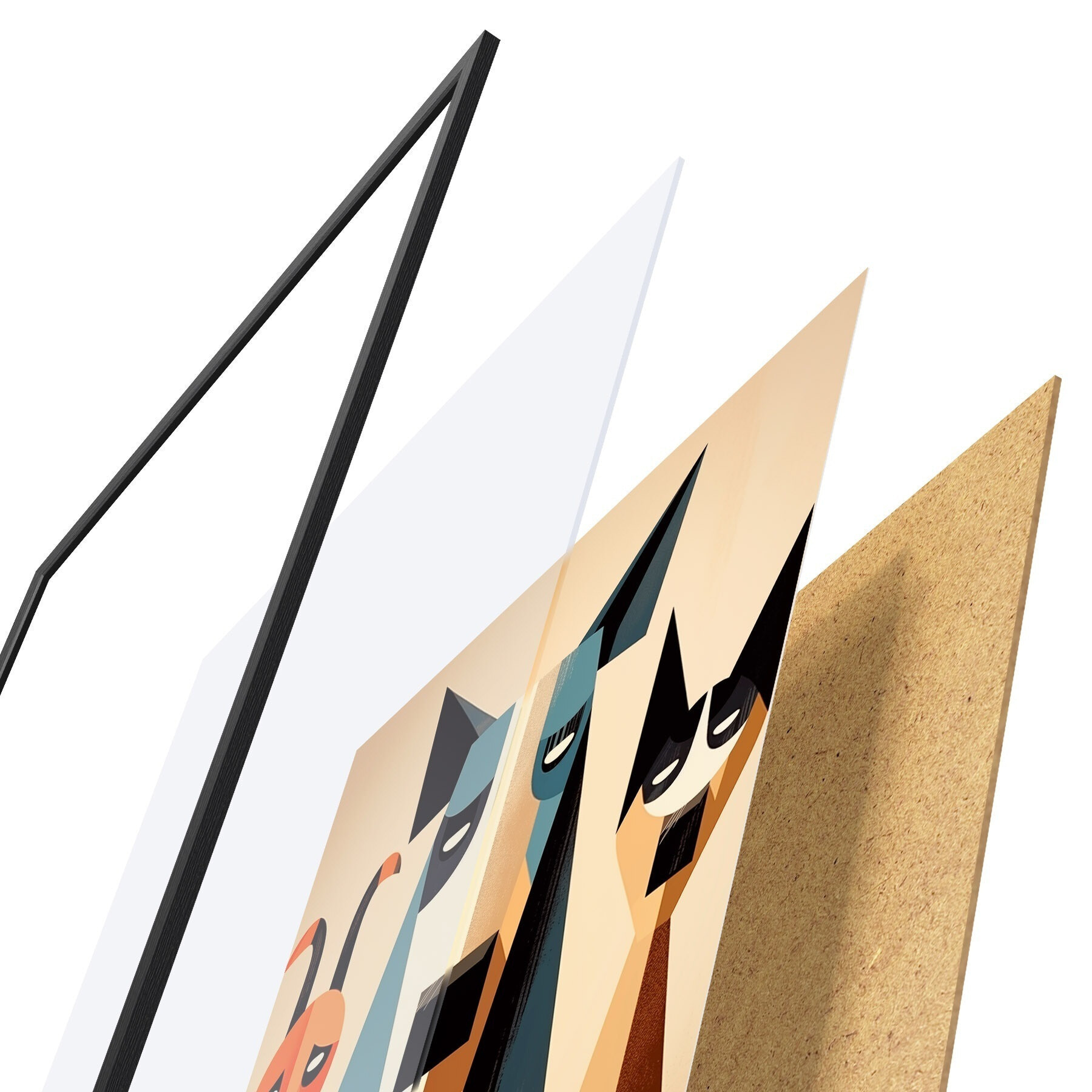 Das Poster besteht aus einem Rahmen, Plexiglas, einem gedruckten Bild und einer Rückwand aus Spanplatten. Dank der Halterungen auf der Rückseite kann das Poster sofort an die Wand gehängt werden.