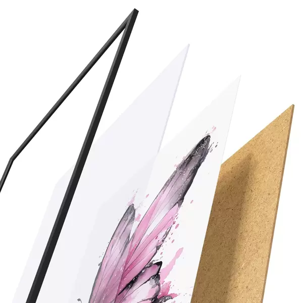 Das Poster besteht aus einem Rahmen, Plexiglas, einem gedruckten Bild und einer Rückwand aus Spanplatten. Dank der Halterungen auf der Rückseite kann das Poster sofort an die Wand gehängt werden.