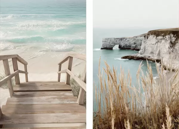 Poster Klippen an der Küste und trockenes Gras am türkisfarbenen Meer d00875