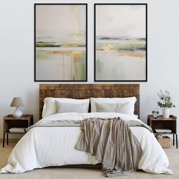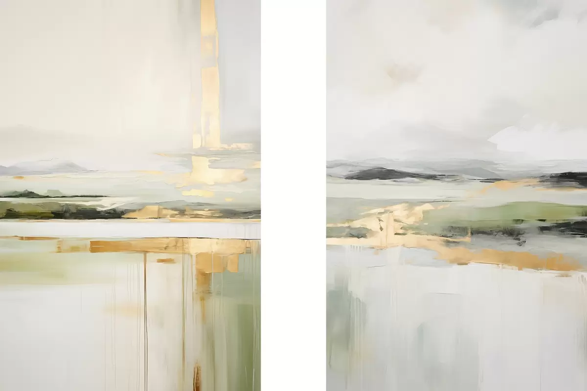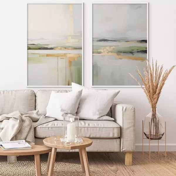 Poster Abstrakte Landschaft mit gelben Akzenten, eine minimalistische Komposition aus Land, Wasser und Himmel, mit gedämpften Farben Nr d00877