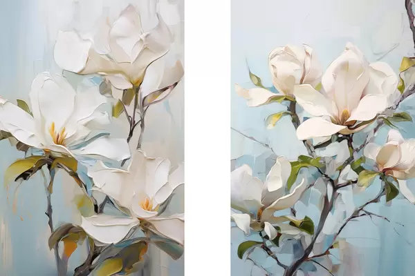 Poster Weiße Magnolienblüten, hellblauer Hintergrund mit sanften Pinselstrichen, Ölgemälde-Stil, pastose Textur d00881