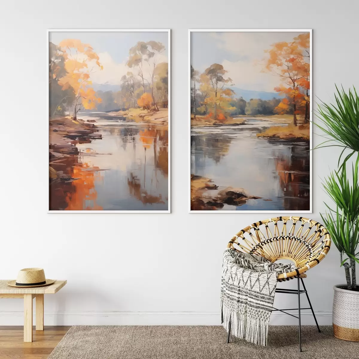 Poster Herbstlandschaft, Fluss mit Bäumen am Ufer, Wald im Hintergrund, Spiegelungen auf dem Wasser d00883