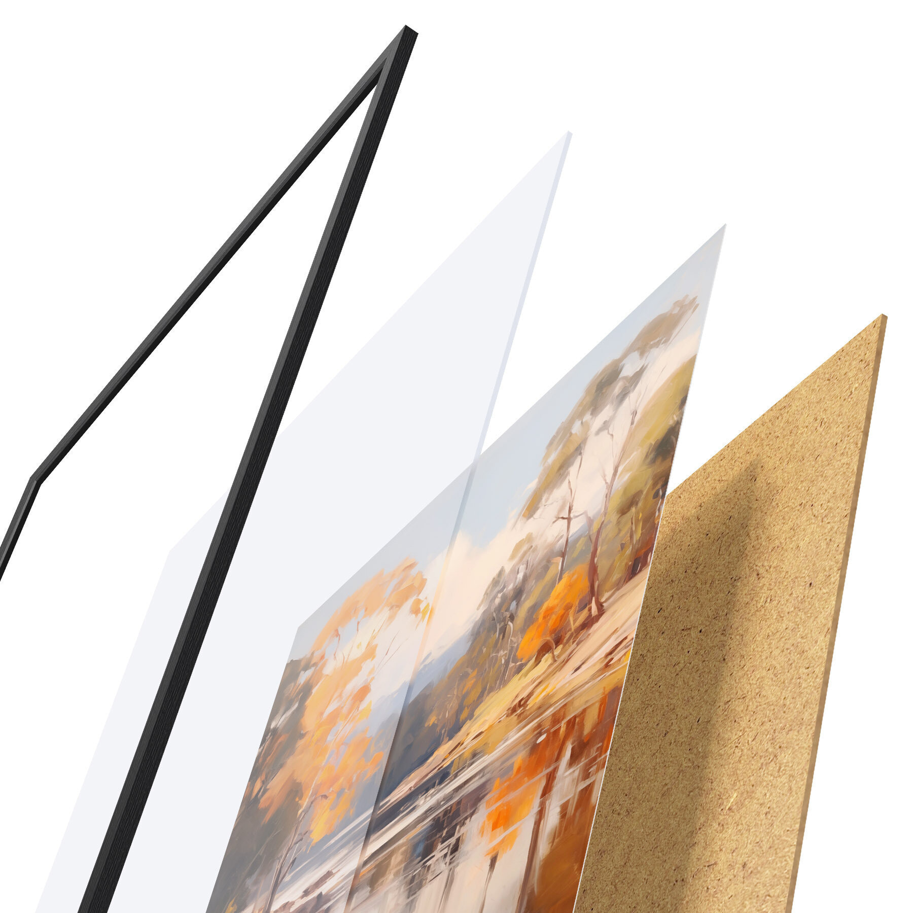 Das Poster besteht aus einem Rahmen, Plexiglas, einem gedruckten Bild und einer Rückwand aus Spanplatten. Dank der Halterungen auf der Rückseite kann das Poster sofort an die Wand gehängt werden.