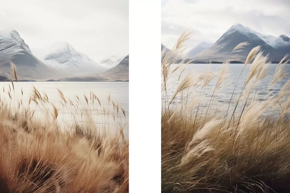 Poster Pampasgras mit einem See und Bergen im Hintergrund, sanfte Beleuchtung, gedämpfte Farben, naturalistischer Stil Nr d00884