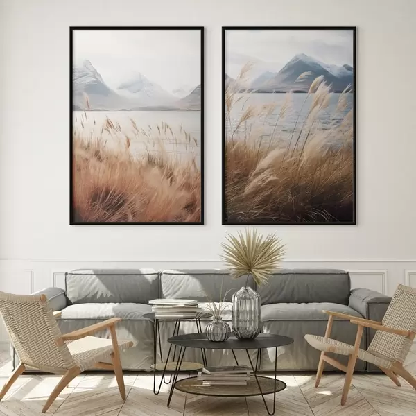 Poster Pampasgras mit einem See und Bergen im Hintergrund, sanfte Beleuchtung, gedämpfte Farben, naturalistischer Stil d00884