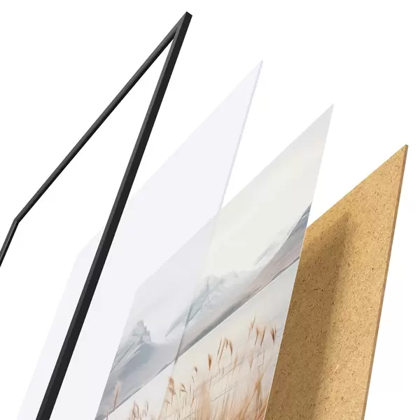 Das Poster besteht aus einem Rahmen, Plexiglas, einem gedruckten Bild und einer Rückwand aus Spanplatten. Dank der Halterungen auf der Rückseite kann das Poster sofort an die Wand gehängt werden.