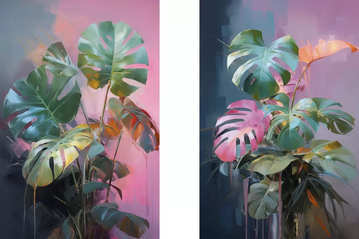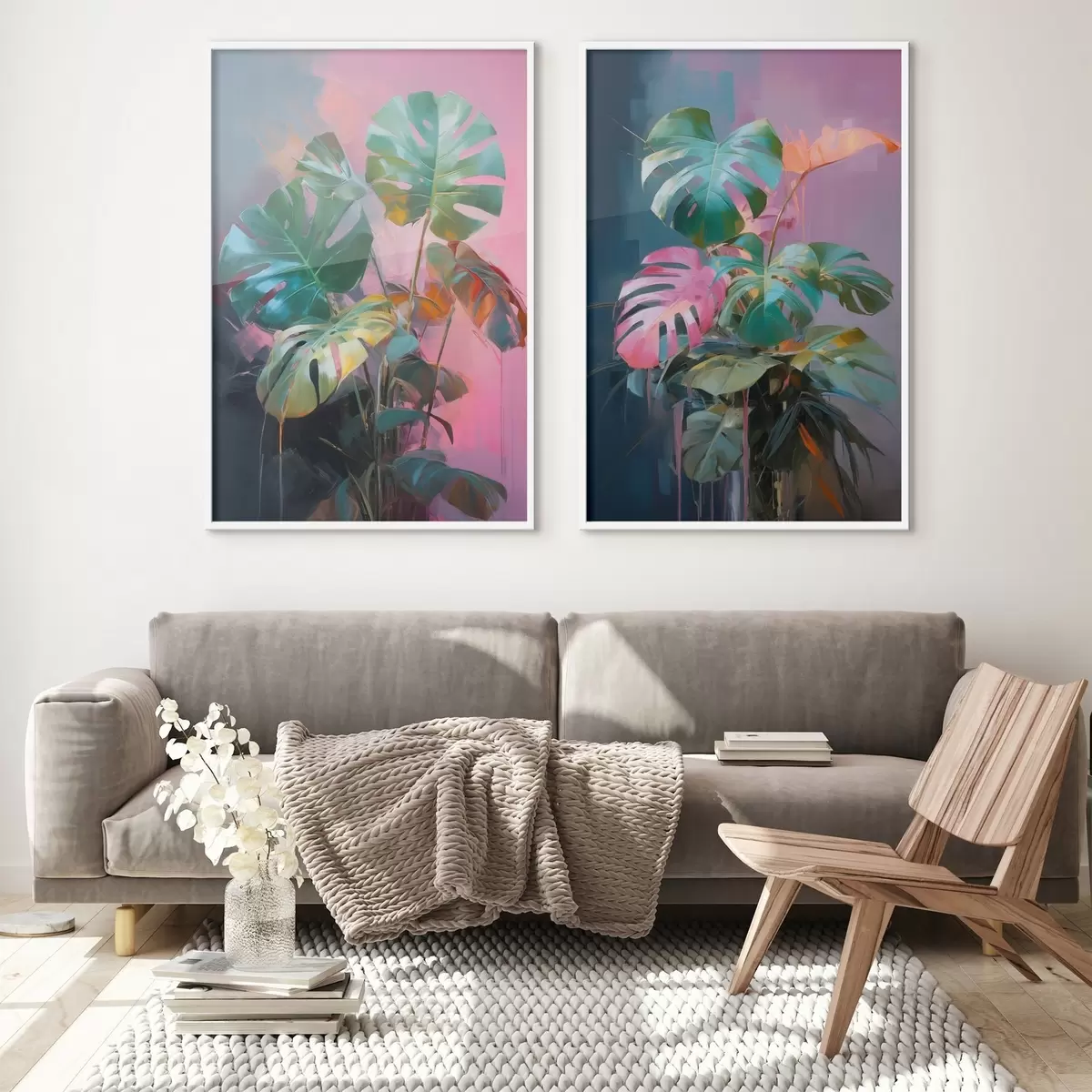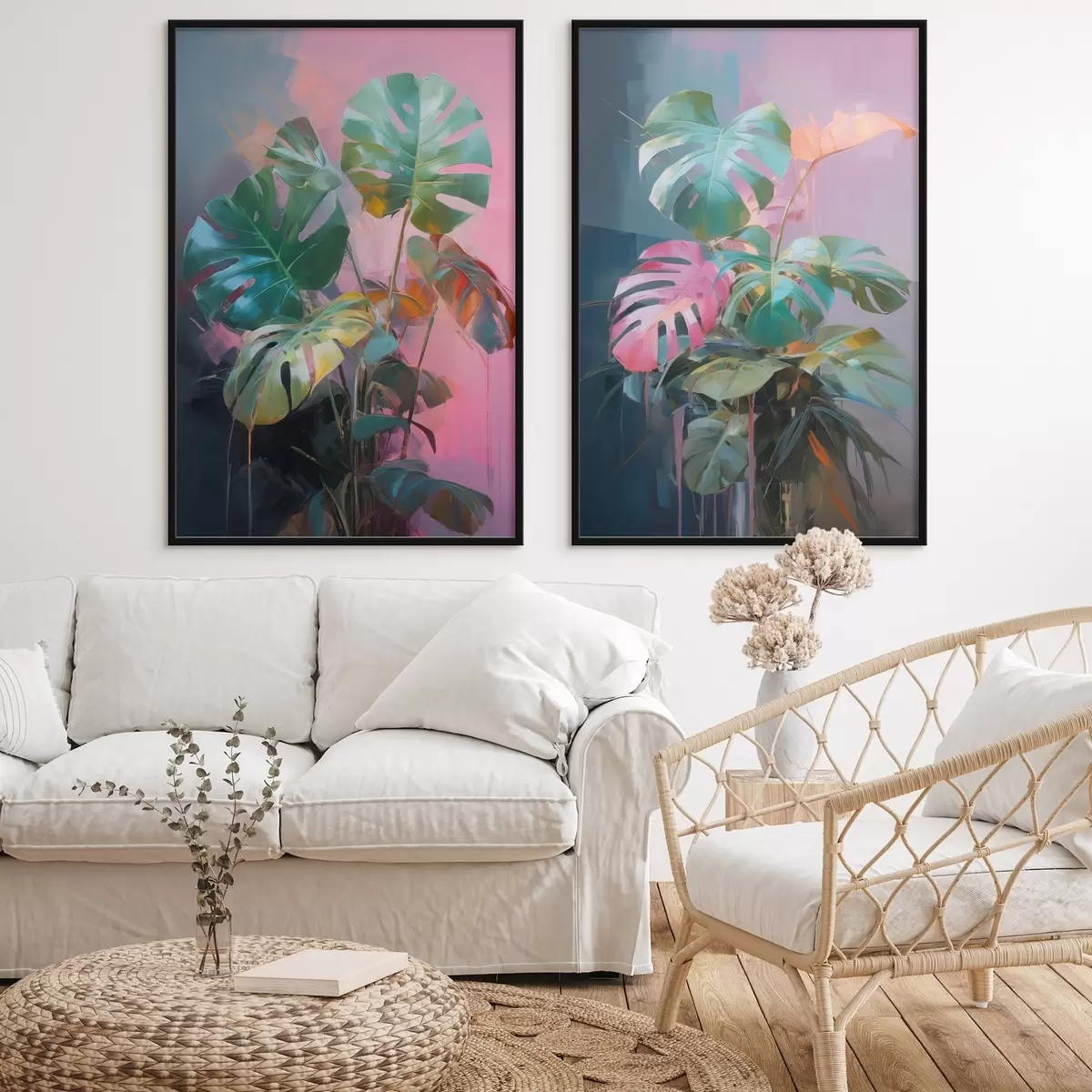 Poster Abstrakte Monstera-Pflanze mit leuchtend grünen Blättern vor einem Hintergrund aus zarten Rosa- und Violetttönen d00886