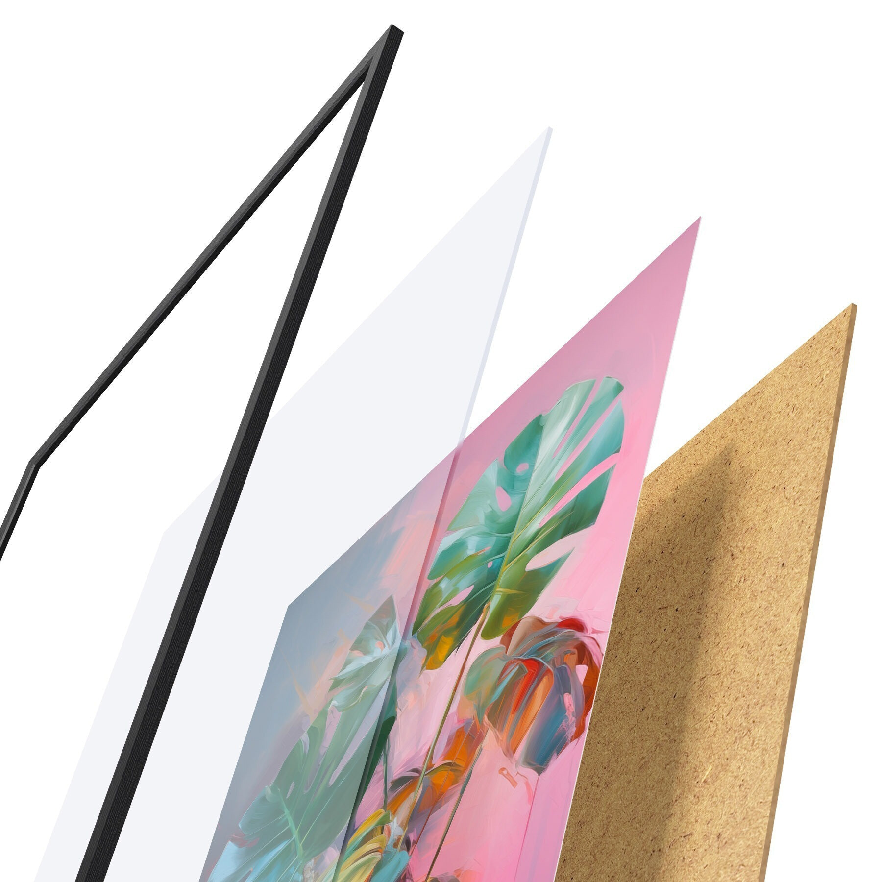 Das Poster besteht aus einem Rahmen, Plexiglas, einem gedruckten Bild und einer Rückwand aus Spanplatten. Dank der Halterungen auf der Rückseite kann das Poster sofort an die Wand gehängt werden.