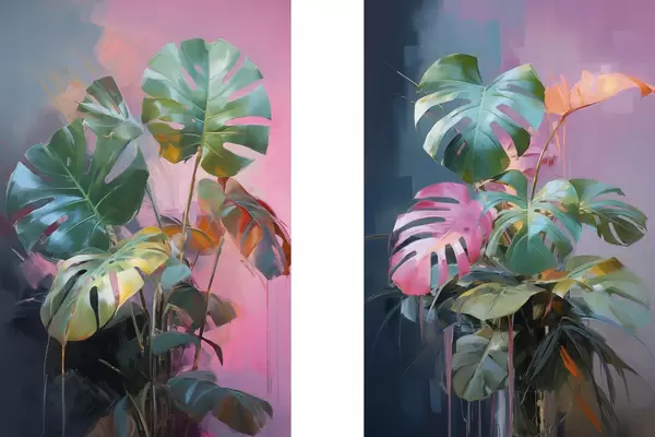 Poster Abstrakte Monstera-Pflanze mit leuchtend grünen Blättern vor einem Hintergrund aus zarten Rosa- und Violetttönen Nr d00886