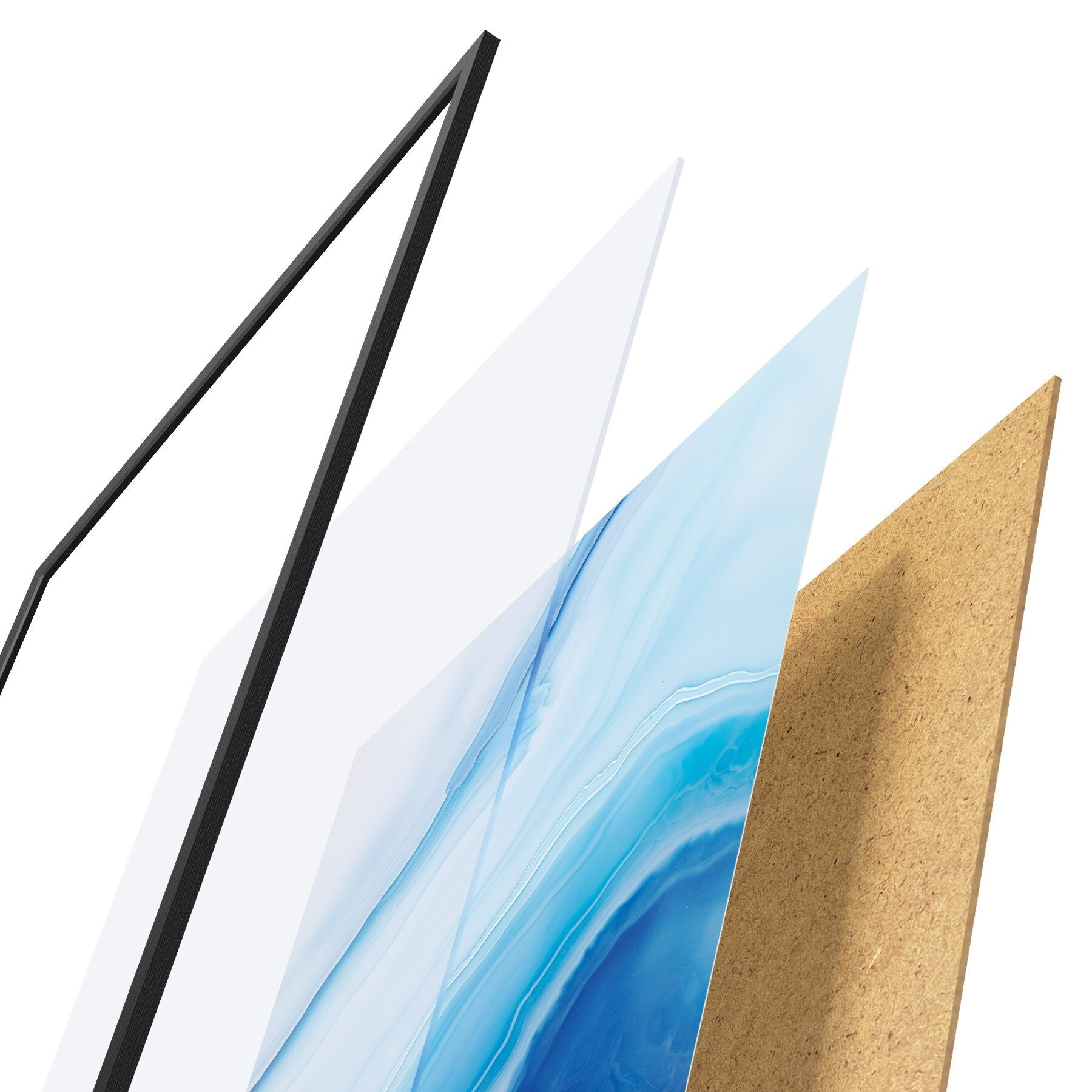 Das Poster besteht aus einem Rahmen, Plexiglas, einem gedruckten Bild und einer Rückwand aus Spanplatten. Dank der Halterungen auf der Rückseite kann das Poster sofort an die Wand gehängt werden.