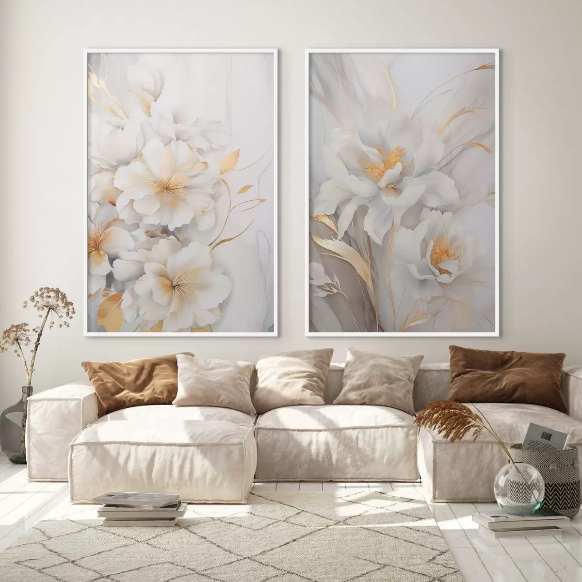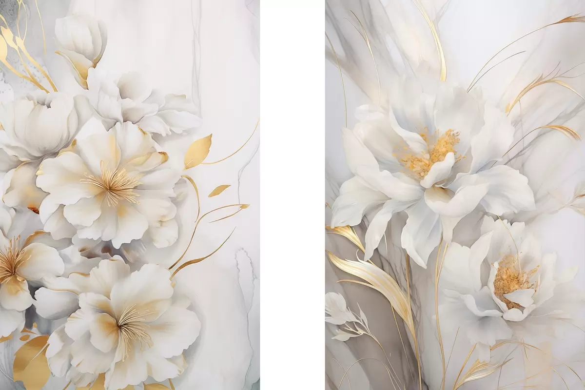 Poster Weiße Blüten mit gelben Details, Blütenblätter mit dezenten Schatten, heller Hintergrund mit dezentem Marmoreffekt Nr d00889
