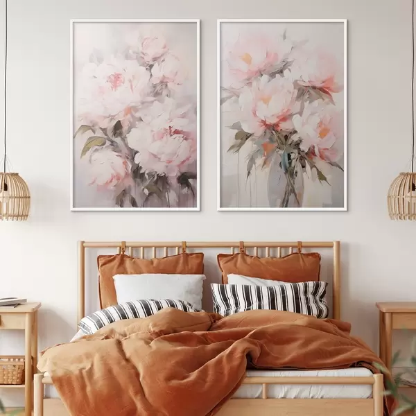 Poster Ein Strauß hellrosa Pfingstrosen mit grünen Blättern, sanfte Pinselstriche, Pastellfarben, auf hellem Hintergrund Nr d00890
