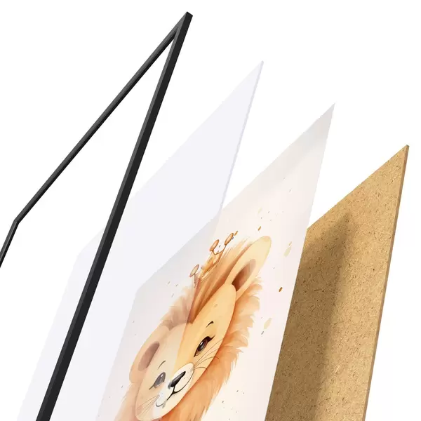Das Poster besteht aus einem Rahmen, Plexiglas, einem gedruckten Bild und einer Rückwand aus Spanplatten. Dank der Halterungen auf der Rückseite kann das Poster sofort an die Wand gehängt werden.
