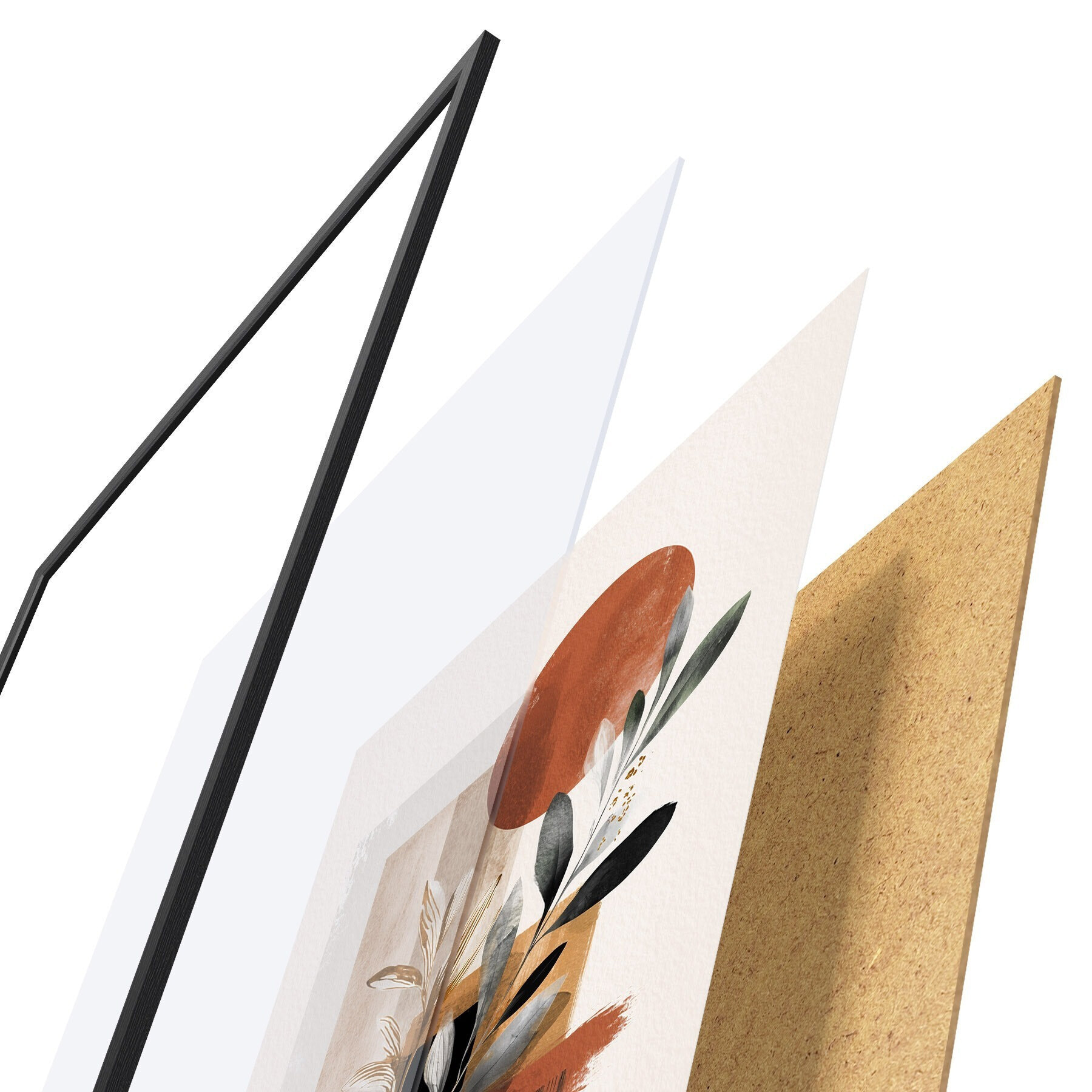 Das Poster besteht aus einem Rahmen, Plexiglas, einem gedruckten Bild und einer Rückwand aus Spanplatten. Dank der Halterungen auf der Rückseite kann das Poster sofort an die Wand gehängt werden.