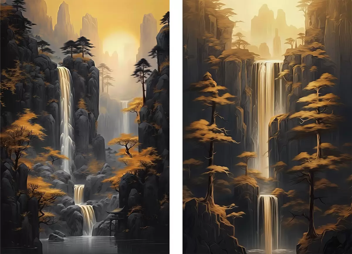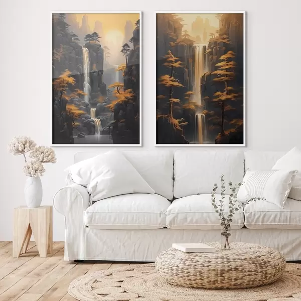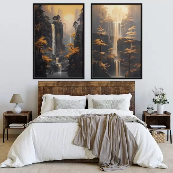 Poster Landschaft mit Wasserfall und Bergen in goldenem Licht Nr d00928