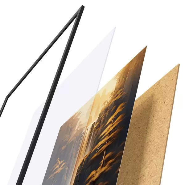 Das Poster besteht aus einem Rahmen, Plexiglas, einem gedruckten Bild und einer Rückwand aus Spanplatten. Dank der Halterungen auf der Rückseite kann das Poster sofort an die Wand gehängt werden.