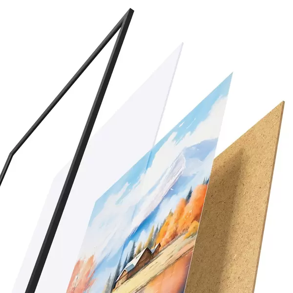 Das Poster besteht aus einem Rahmen, Plexiglas, einem gedruckten Bild und einer Rückwand aus Spanplatten. Dank der Halterungen auf der Rückseite kann das Poster sofort an die Wand gehängt werden.