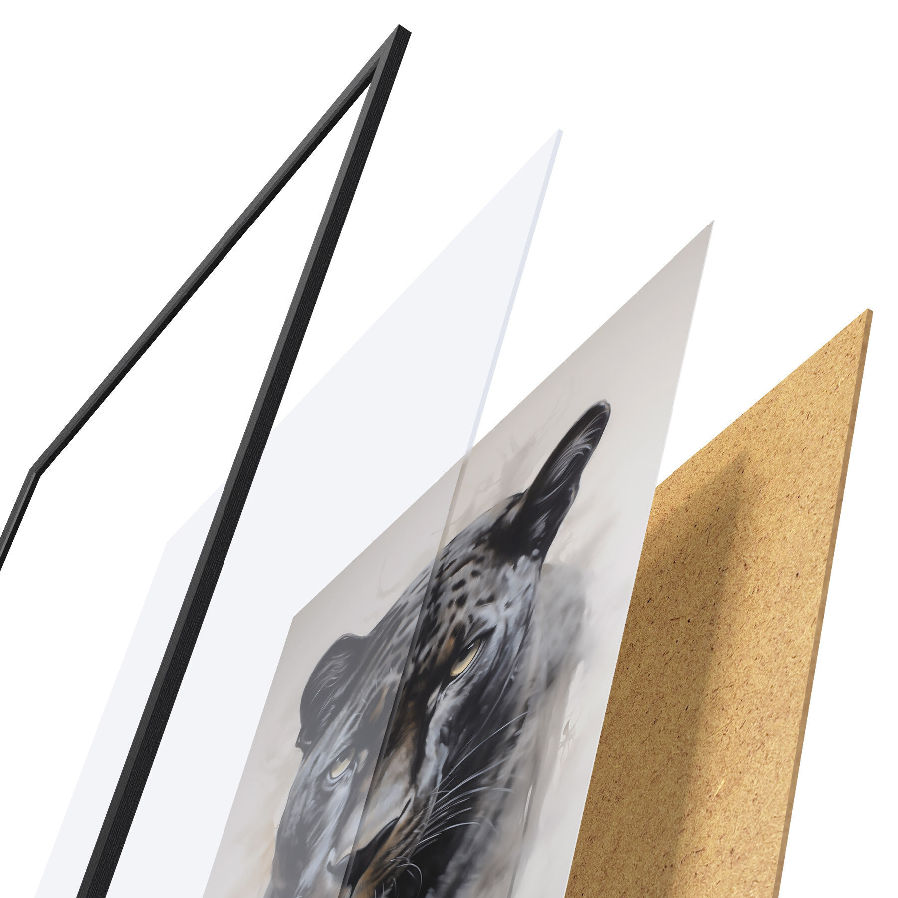 Das Poster besteht aus einem Rahmen, Plexiglas, einem gedruckten Bild und einer Rückwand aus Spanplatten. Dank der Halterungen auf der Rückseite kann das Poster sofort an die Wand gehängt werden.