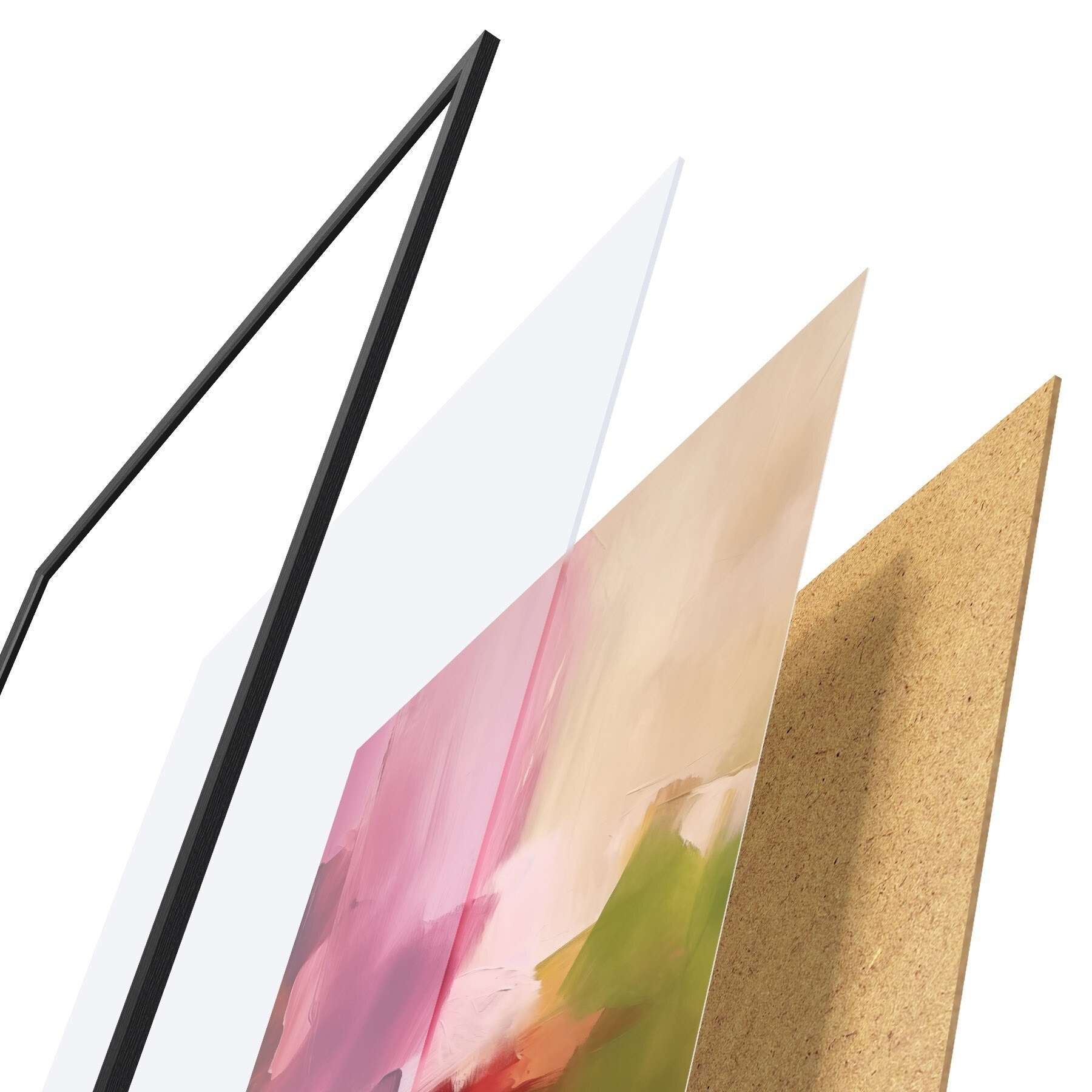 Das Poster besteht aus einem Rahmen, Plexiglas, einem gedruckten Bild und einer Rückwand aus Spanplatten. Dank der Halterungen auf der Rückseite kann das Poster sofort an die Wand gehängt werden.