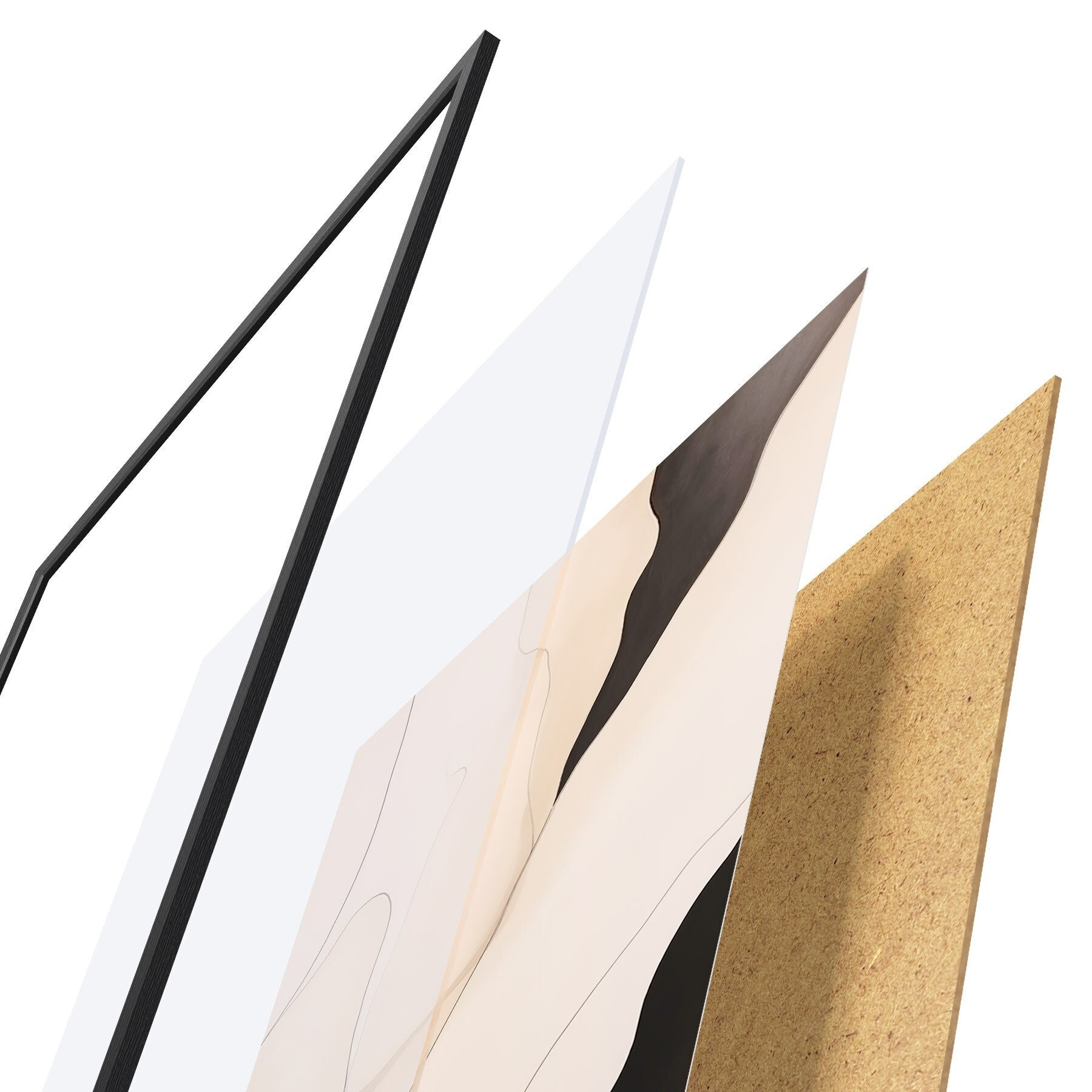 Das Poster besteht aus einem Rahmen, Plexiglas, einem gedruckten Bild und einer Rückwand aus Spanplatten. Dank der Halterungen auf der Rückseite kann das Poster sofort an die Wand gehängt werden.