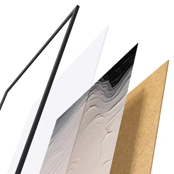 Das Poster besteht aus einem Rahmen, Plexiglas, einem gedruckten Bild und einer Rückwand aus Spanplatten. Dank der Halterungen auf der Rückseite kann das Poster sofort an die Wand gehängt werden.