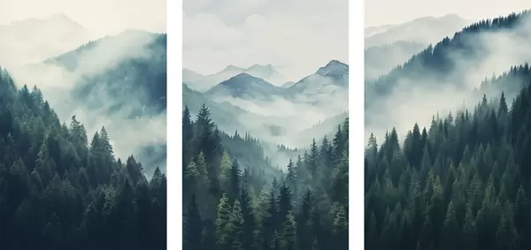 Poster Nebelverhangene Kiefernberge in sanften Grün- und Blautönen Nr d00964