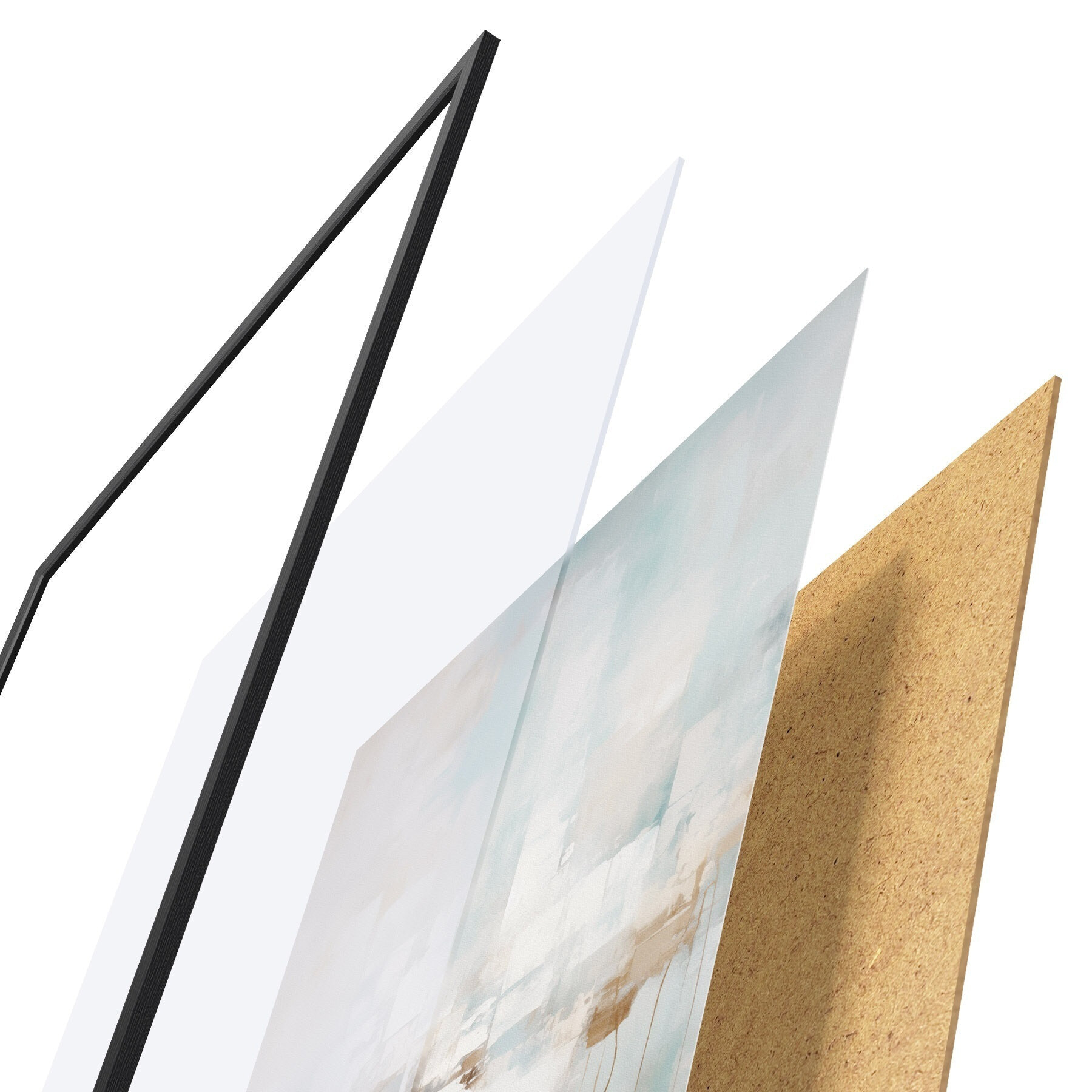 Das Poster besteht aus einem Rahmen, Plexiglas, einem gedruckten Bild und einer Rückwand aus Spanplatten. Dank der Halterungen auf der Rückseite kann das Poster sofort an die Wand gehängt werden.