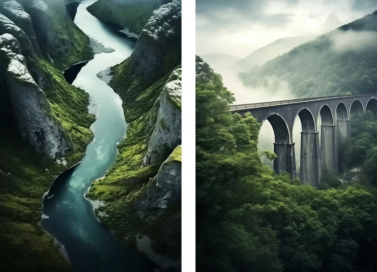 Poster Luftbild einer Flussschlucht und eines nebligen Viadukts inmitten grüner Hügel Nr d00967