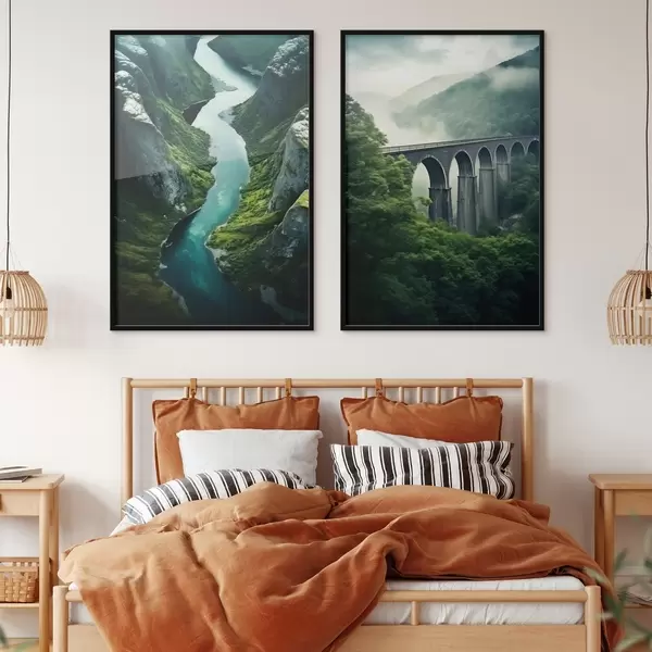 Poster Luftbild einer Flussschlucht und eines nebligen Viadukts inmitten grüner Hügel d00967