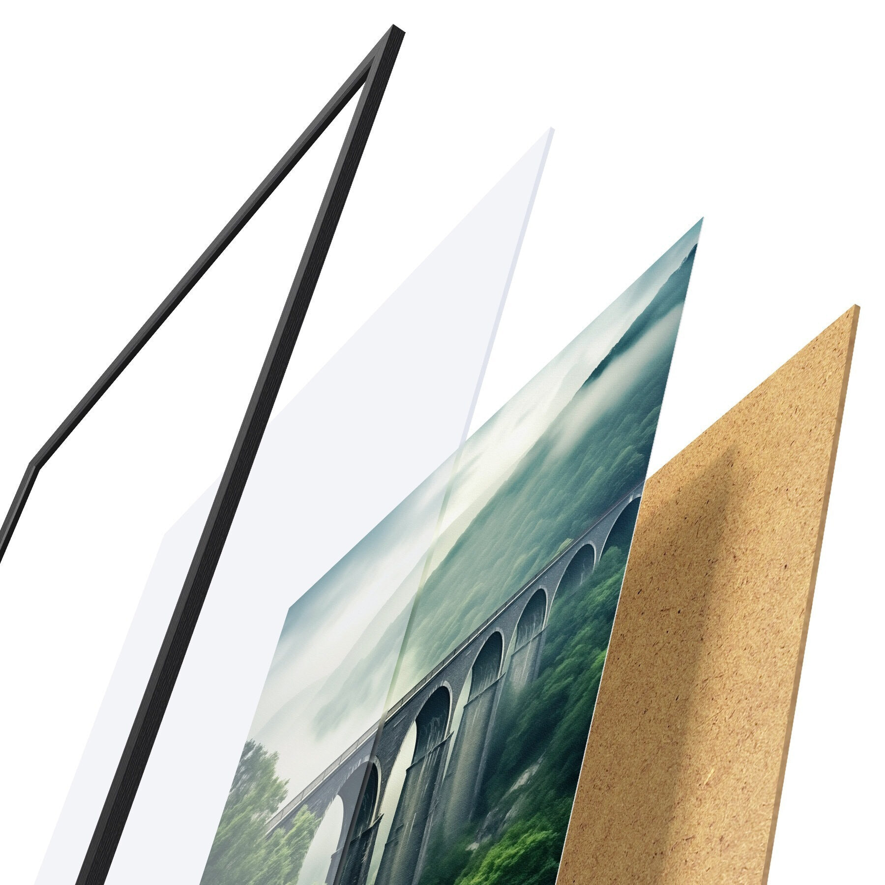 Das Poster besteht aus einem Rahmen, Plexiglas, einem gedruckten Bild und einer Rückwand aus Spanplatten. Dank der Halterungen auf der Rückseite kann das Poster sofort an die Wand gehängt werden.