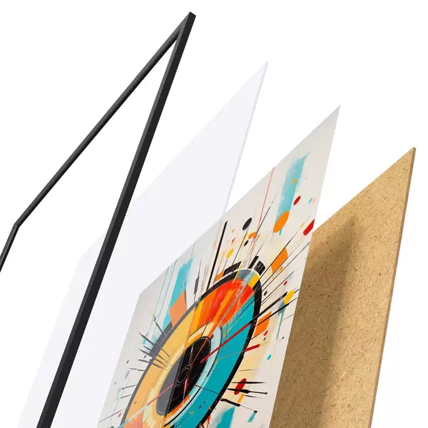 Das Poster besteht aus einem Rahmen, Plexiglas, einem gedruckten Bild und einer Rückwand aus Spanplatten. Dank der Halterungen auf der Rückseite kann das Poster sofort an die Wand gehängt werden.