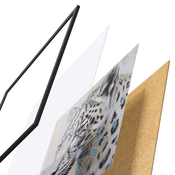 Das Poster besteht aus einem Rahmen, Plexiglas, einem gedruckten Bild und einer Rückwand aus Spanplatten. Dank der Halterungen auf der Rückseite kann das Poster sofort an die Wand gehängt werden.