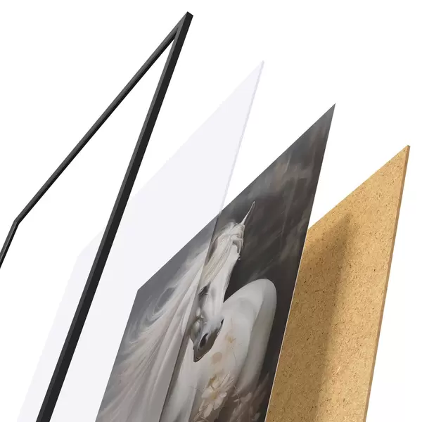 Das Poster besteht aus einem Rahmen, Plexiglas, einem gedruckten Bild und einer Rückwand aus Spanplatten. Dank der Halterungen auf der Rückseite kann das Poster sofort an die Wand gehängt werden.