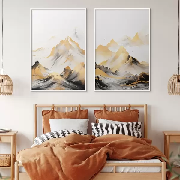 Poster Strukturierte gelbe und schwarze Berge mit schneebedeckten Gipfeln, Tuschemalerei-Stil, minimalistische Bergkette Nr d01002