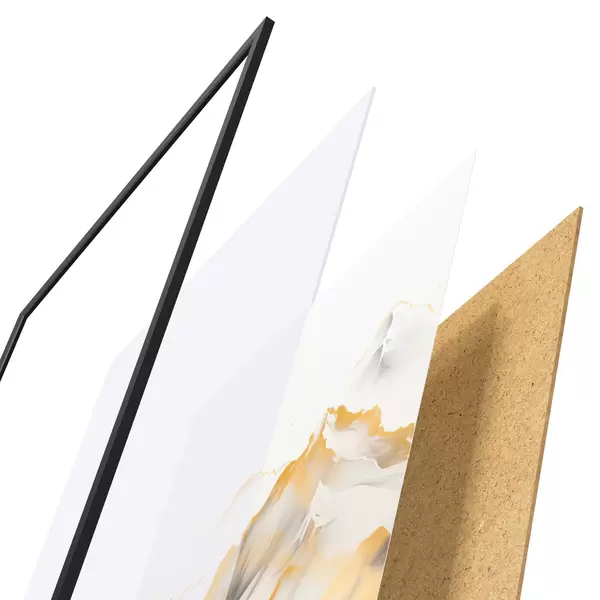 Das Poster besteht aus einem Rahmen, Plexiglas, einem gedruckten Bild und einer Rückwand aus Spanplatten. Dank der Halterungen auf der Rückseite kann das Poster sofort an die Wand gehängt werden.