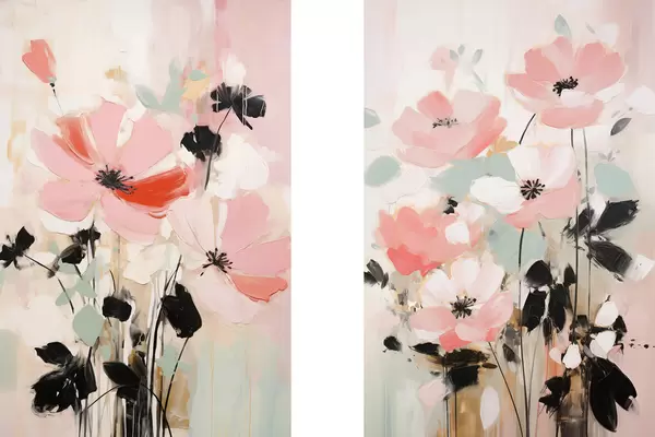 Poster Rosa und schwarze Blumen mit Blättern, sanfte Pastellfarben, abstraktes Blumenarrangement, minimalistische Kunst d01004