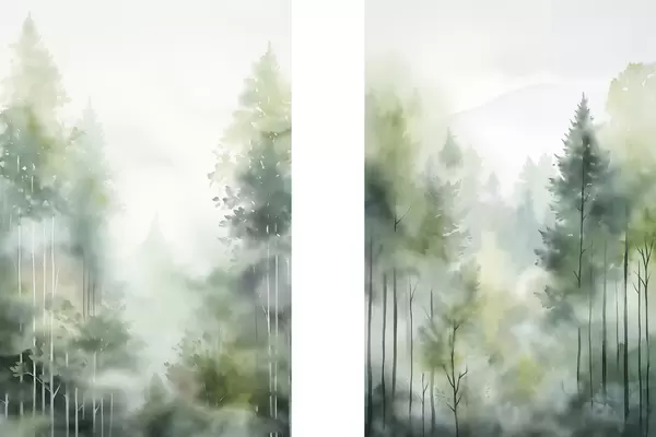 Poster Aquarellmalerei, die einen abstrakten Wald mit hohen Bäumen und grünem Laub imitiert, in sanften, gedämpften Farben Nr d01005