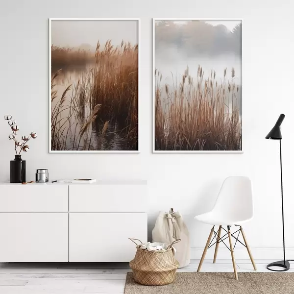 Poster Hohe Schilfpflanzen wachsen in einem Gewässer, das Wasser spiegelt die Schilfpflanzen wider, nebliger Hintergrund, sanftes Licht, Naturszene Nr d01008