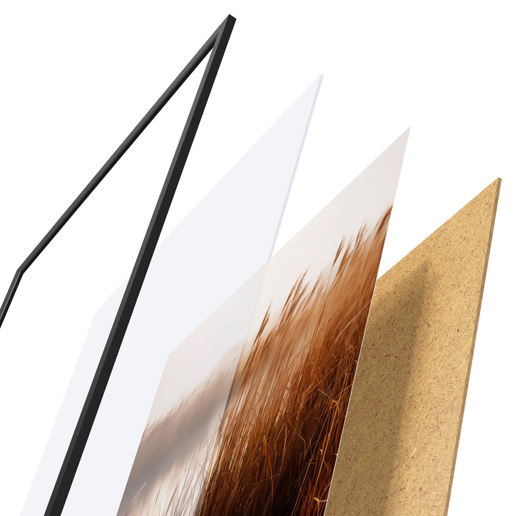Das Poster besteht aus einem Rahmen, Plexiglas, einem gedruckten Bild und einer Rückwand aus Spanplatten. Dank der Halterungen auf der Rückseite kann das Poster sofort an die Wand gehängt werden.