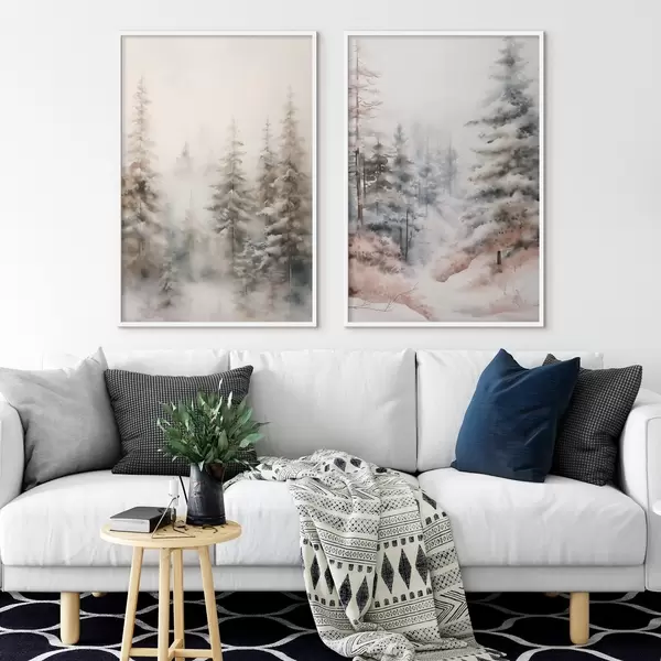 Poster Hohe, schneebedeckte Kiefern stehen in einem nebligen Wald, eine sanfte, gedämpfte Winterszene. d01011