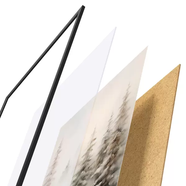 Das Poster besteht aus einem Rahmen, Plexiglas, einem gedruckten Bild und einer Rückwand aus Spanplatten. Dank der Halterungen auf der Rückseite kann das Poster sofort an die Wand gehängt werden.
