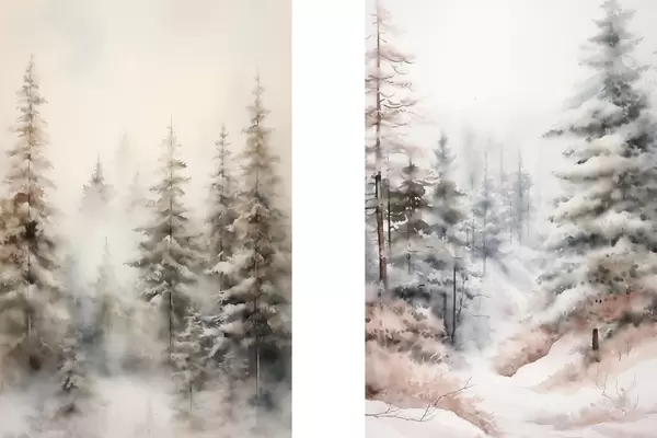 Poster Hohe, schneebedeckte Kiefern stehen in einem nebligen Wald, eine sanfte, gedämpfte Winterszene. d01011